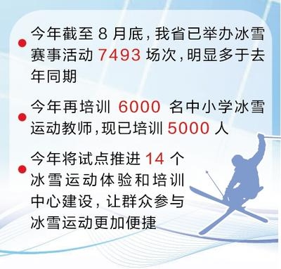 继续因地制宜推进冰雪运动进校园、进企业、进机关、进社区、进乡村等。从7月开始,省体育局联合省教育厅,组织开展了新一年的中小学冰雪运动教师培训。今年全省将有6000名中小学体育教师,分批次接受冰球、陆地冰壶、轮滑、速滑等项目的培训,截至目前,已培训20期、5000人。启动了新一年的农村中小学配备轮滑鞋计划,安排500万元用于农村中小学轮滑鞋采购、配发工作,现已完成采购方案报审。(记者 陈华)