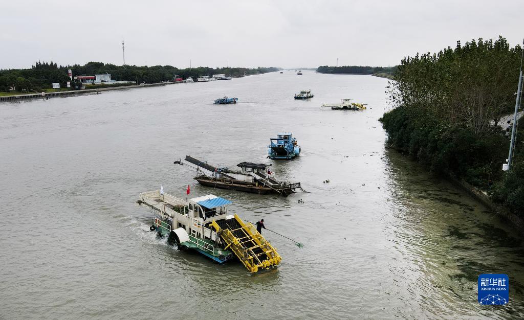 苏浙沪三地的保洁船在太浦河水域联合清理水面浮游植物(2020年10月15日摄,无人机照片)。当日,来自苏州市吴江区、上海市青浦区和嘉兴市嘉善县的三名河长在位于长三角生态绿色一体化发展示范区的苏浙沪交界水域太浦河流域附近开展联合巡河活动。新华社记者方喆 摄