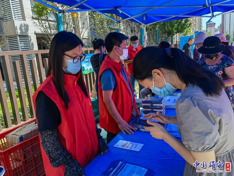 在容东片区南张堡社区,网络安全宣讲点工作人员向过往群众宣讲网络安全知识。中国雄安官网李元闯 摄