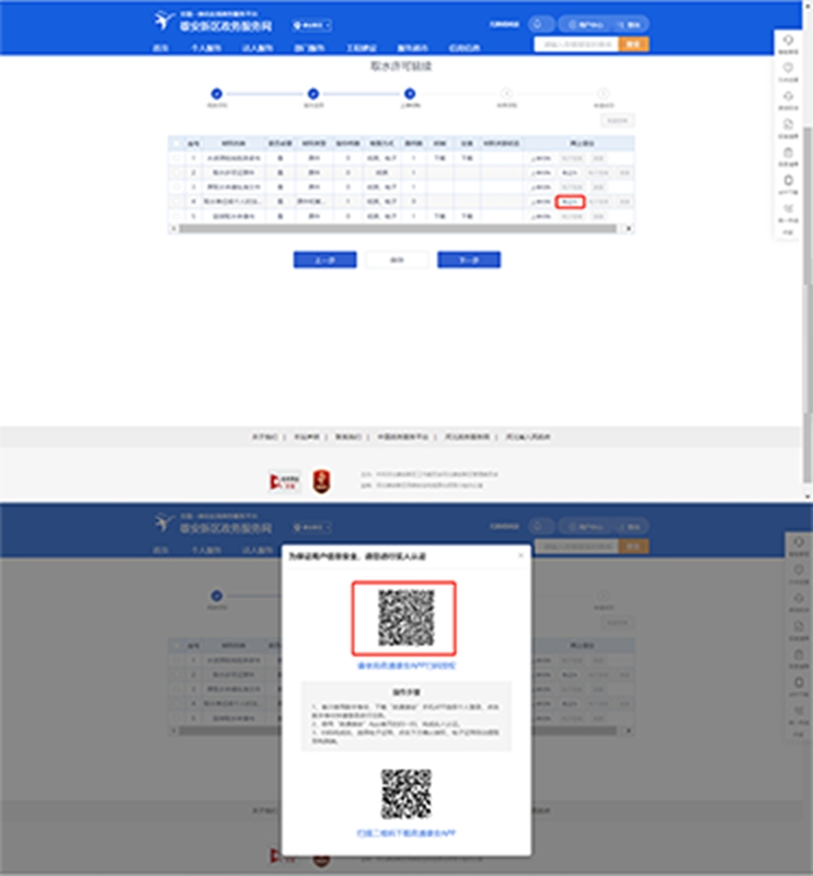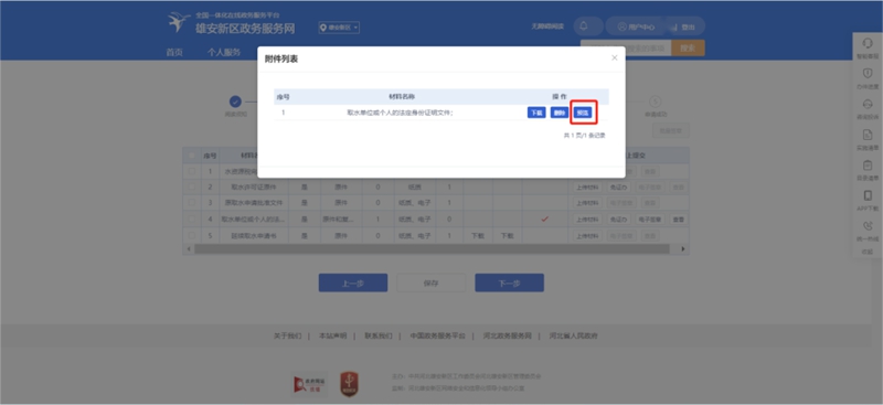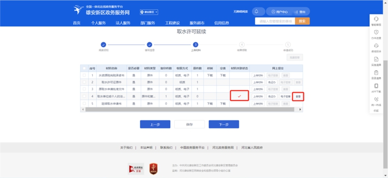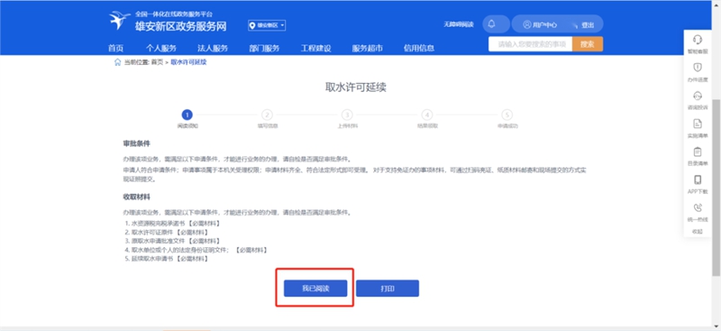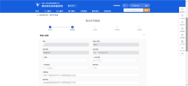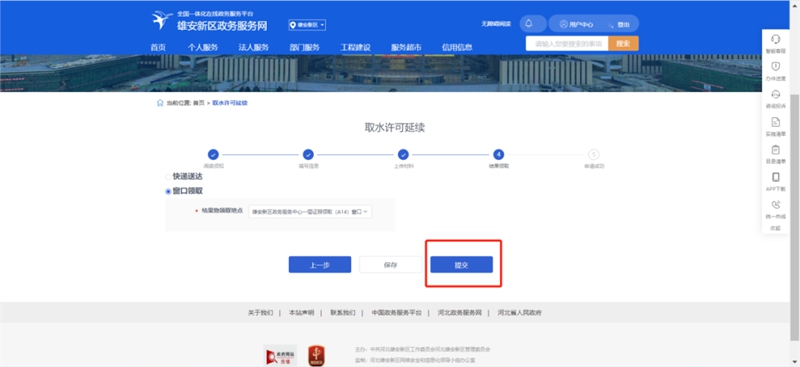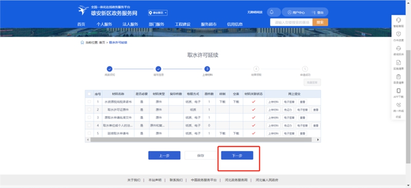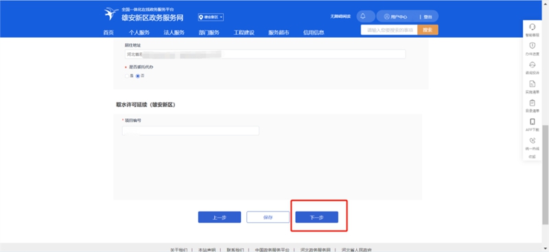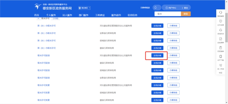 1.登录“雄安新区政务服务网”(网址:http://zwfw.xiongan.gov.cn/)选择要办理的事项——取水许可延续,点击“在线办理”。