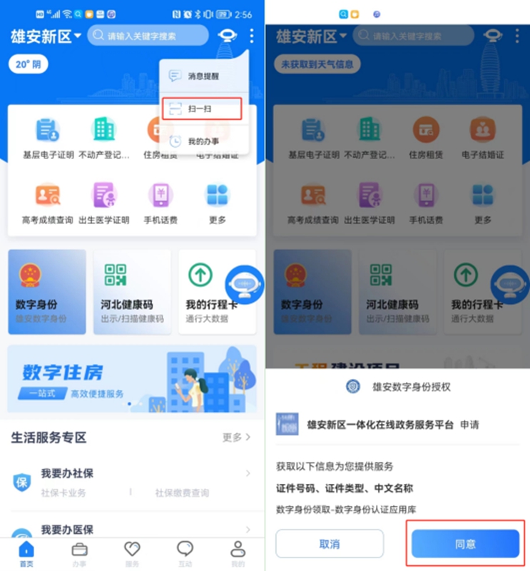 3.点击“数字身份免证办”并通过“政通雄安APP”扫码授权。(点击查看👉数字身份申领指南)