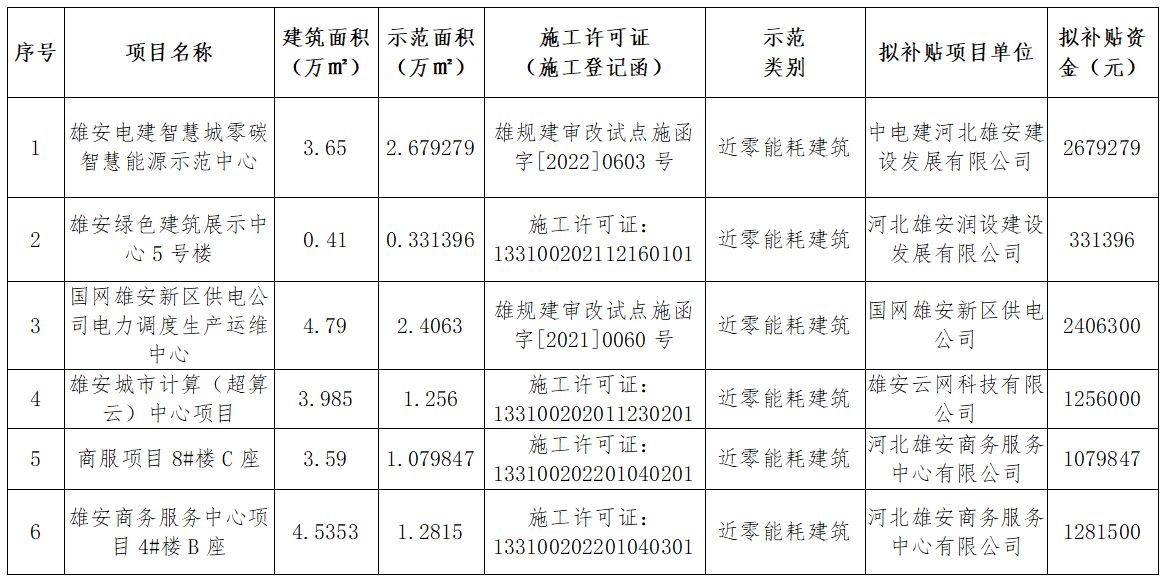 根据《河北雄安新区管理委员会规划建设局关于组织开展2022年度雄安新区绿色建筑示范项目(第一批)申报工作的通知》要求,经公开申报和专家评审,拟确定雄安电建智慧城零碳智慧能源示范中心等6个项目为2022年度雄安新区绿色建筑示范项目(第一批),并予以资金补助(详见附件),现进行公示,接受社会监督。