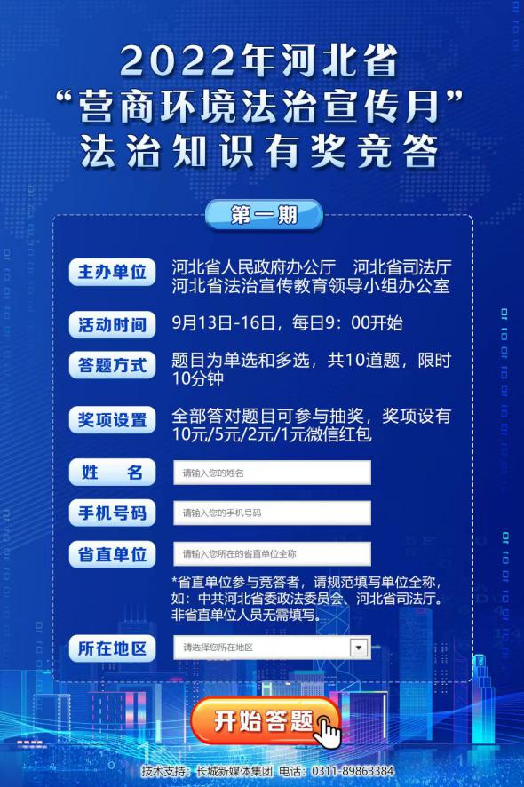 为深入贯彻落实习近平法治思想,全面落实省委十届二次全会精神和全省优化营商环境大会部署,深入推进全省法治化营商环境建设,根据2022年河北省“营商环境法治宣传月”活动安排,河北省人民政府办公厅、河北省司法厅、河北省法治宣传教育领导小组办公室联合有关部门将从9月13日起至9月30日,举办“营商环境法治宣传月”法治知识有奖竞答活动。