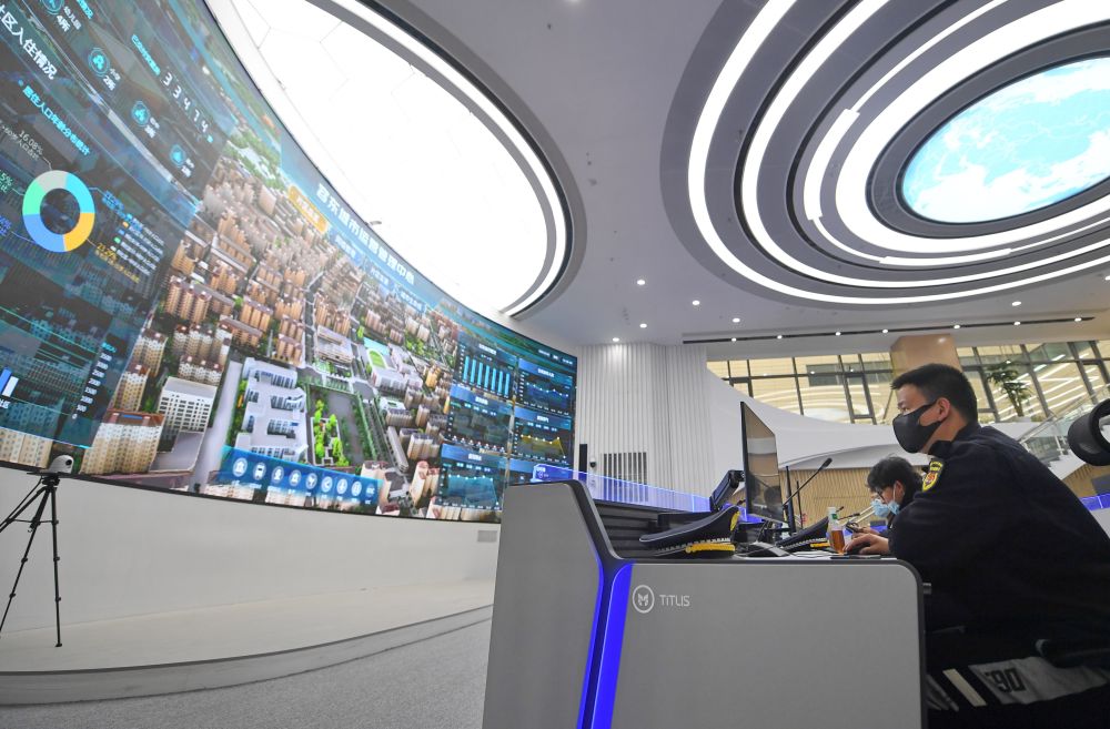 ↑2022年3月29日,工作人员在雄安新区容东城市运营管理中心监管平台工作。