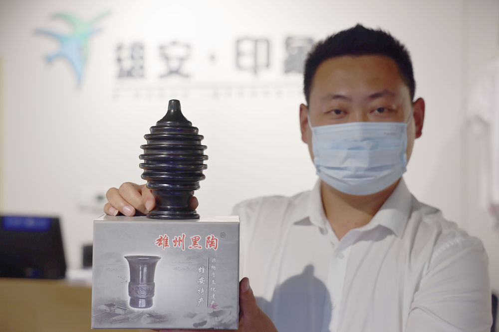 ↑2022年9月6日,工作人员在展示雄安新区的文创纪念品。
