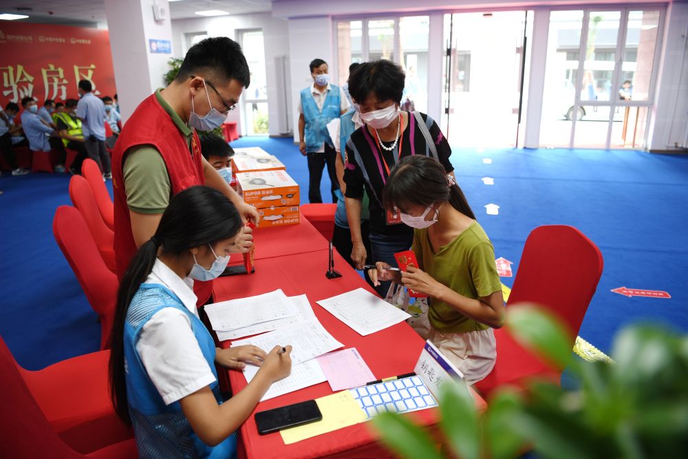 ↑2022年8月26日,回迁居民在雄安新区雄东片区A单元安置房交付点领取钥匙。