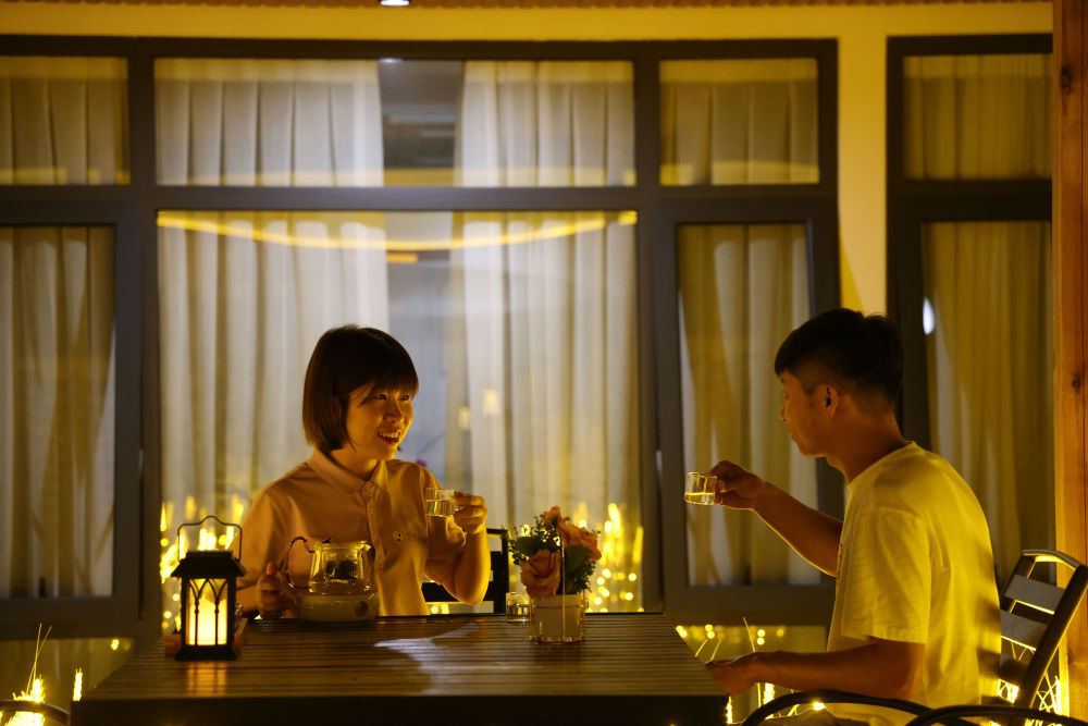 ↑2022年9月6日,在雄安新区经营民宿的雄安人韩星(左)在和客人交流。