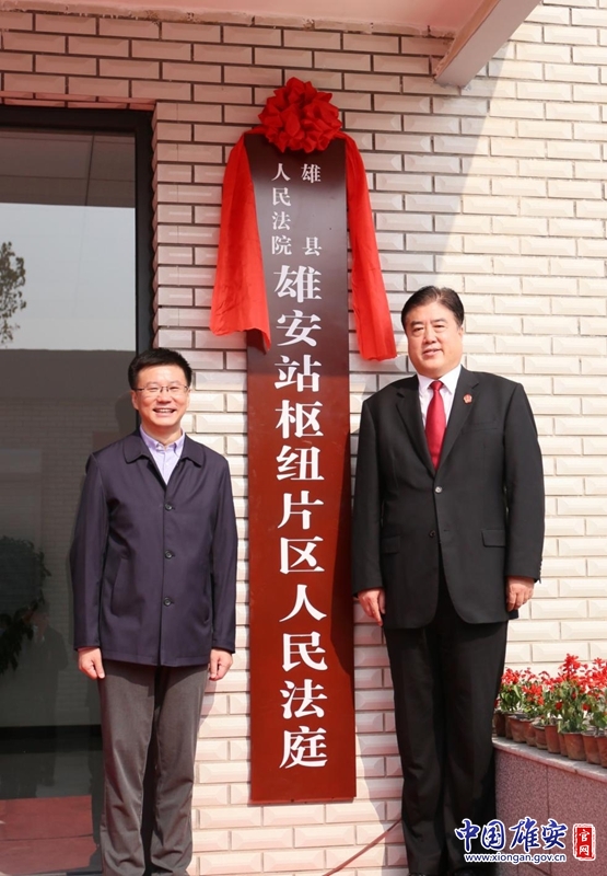 雄安新区党工委委员、管委会副主任陈峰,雄安中院党组书记、院长刘光辉共同为雄县人民法院雄安站枢纽片区人民法庭揭牌。雄安中院供图