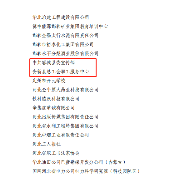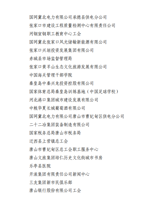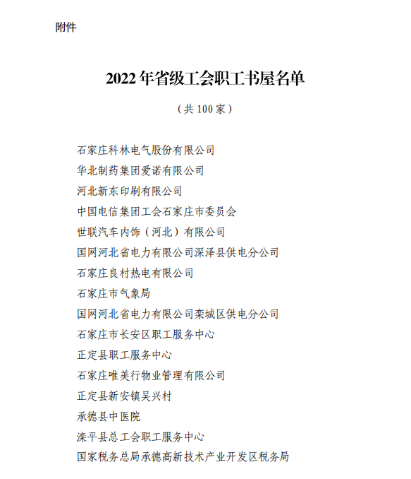 2022年,全省各级工会按照《河北省总工会办公室关于做好2022年职工书屋建设工作的通知》(〔2022]-16号)要求,积极开展职工书屋建设,组织了丰富多彩的职工阅读交流活动,各地各单位工会在加强本级职工书屋建设的基础上,向省总工会择优推荐了一批基层职工书屋单位,经省总工会审核研究后,最终确定了石家庄科林电气股份有限公司等100个单位为省级工会职工书屋,现予以公布。