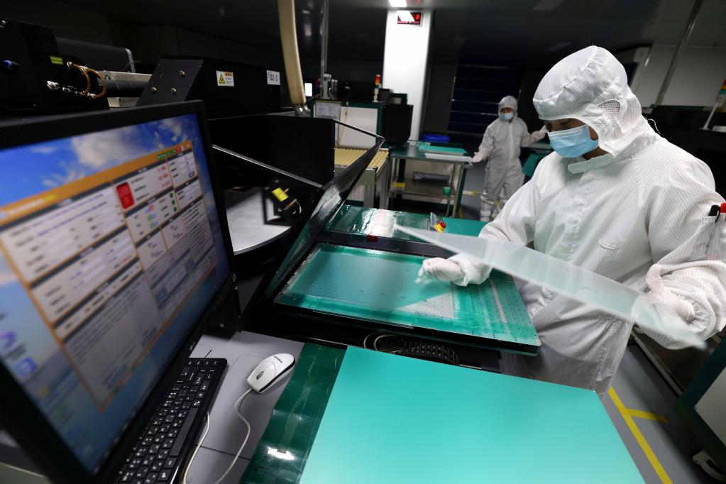 在安徽合肥新站高新区一家智能装备制造企业,技术人员在玻璃基材导光板生产线上作业。(新华社发)