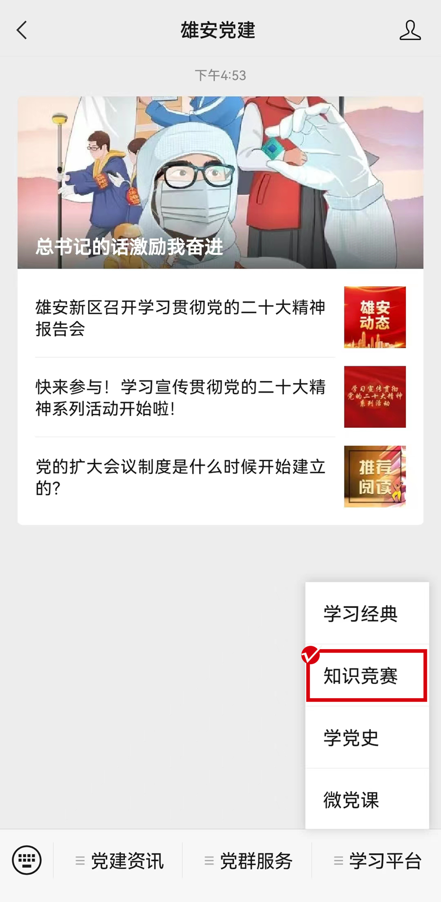 方式二:点击下方公众号卡片,关注“雄安党建”微信公众号,进入“学习平台-知识竞赛”栏目参与。