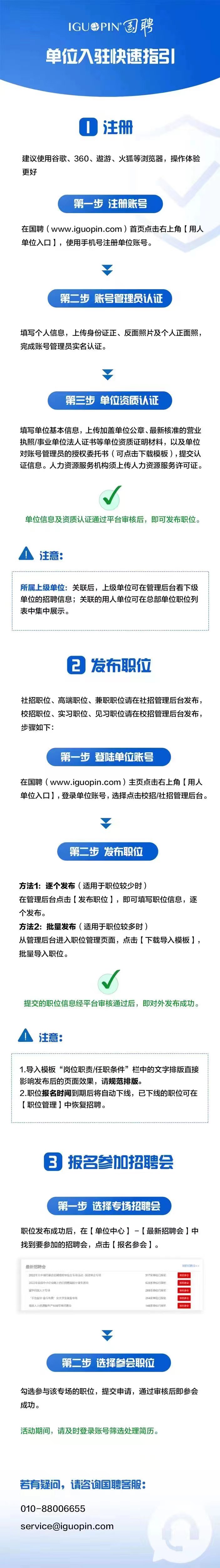 “国聘行动”雄安未来之城高质量发展专场线上专区已于11月29日在国聘网(www.iguopin.com)正式上线。新区各企业如有招聘需求,请于12月9日前登陆国聘网首页点击线上专区后,在页面右上角点击用人单位入口,先进行单位注册并发布招聘岗位信息(附件2、3为在国聘网线上平台系统发布岗位时批量导入岗位模板)。同时,企业如有意向参与相关专场直播活动,可联系我们进行直播报名。