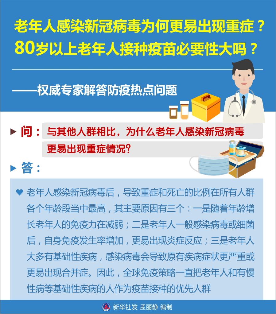 国务院联防联控机制综合组近日印发《加强老年人新冠病毒疫苗接种工作方案》,提出加快提升80岁以上人群接种率,继续提高60-79岁人群接种率。为什么老年人感染新冠病毒更易出现重症情况?80岁以上老年人接种新冠病毒疫苗必要性大吗?围绕社会热点关切,国务院联防联控机制有关专家作出解答。