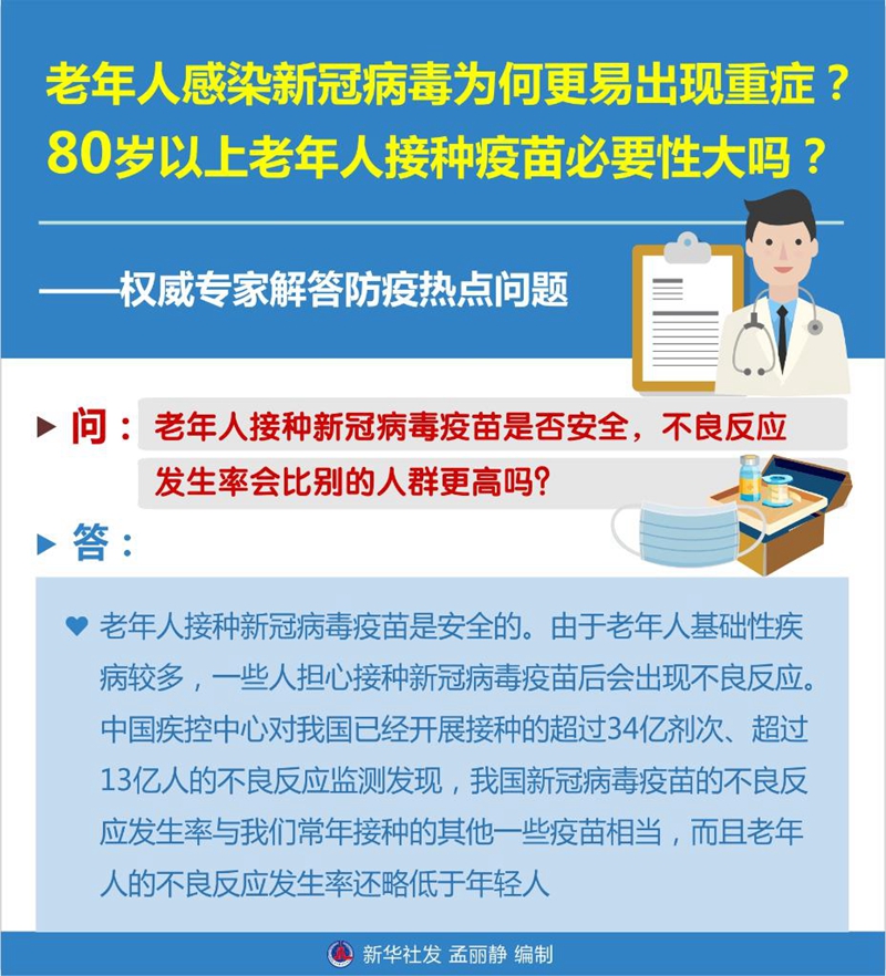 3.问:老年人接种新冠病毒疫苗是否安全,不良反应发生率会比别的人群更高吗?