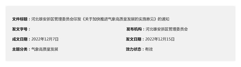 为认真贯彻《国务院关于印发气象高质量发展纲要(2022-2035年)的通知》(国发〔2022〕11号)和《河北省人民政府关于加快推进气象高质量发展的意见》(冀政字〔2022〕37号)精神,高标准落实《河北雄安新区智慧气象发展规划(2020-2035年)》,加快推进雄安新区气象高质量发展,结合实际,提出本实施意见。