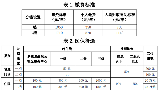 二、个人缴费标准:2023年度居民医保设置两档缴费标准,参保人可自愿选择。一档个人缴费标准为350元,二档个人缴费标准为570元。