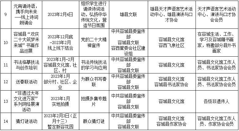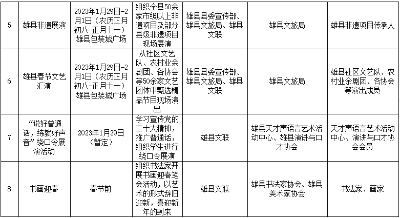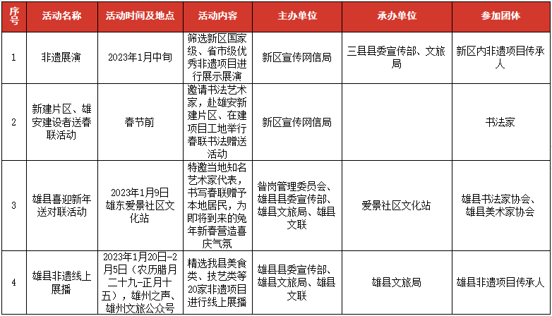 5.元旦春节期间,雄安新区陆续开展包括非遗项目展演、摄影展、春联书写赠送、民俗展演、诗词诵读等多项内容丰富、形式多样的文化活动。
