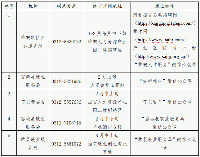 1.开展线上招聘会。1月至3月底不断持续开展线上招聘会,服务对象可登录雄才网(https://www.ixahr.com/)或者关注“雄安人才服务”及县区微信公众号。企业可登录雄才网、雄安公共招聘网、雄安新区产业互联网平台免费参加线上专场招聘会,求职者可登录雄才网、雄安公共招聘网及雄安新区产业互联网平台查找活动专区,适配岗位可直接注册简历后进行投递。