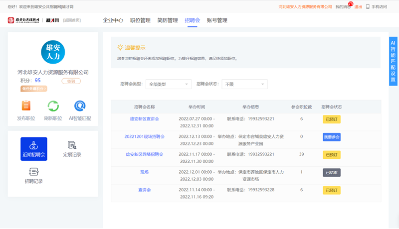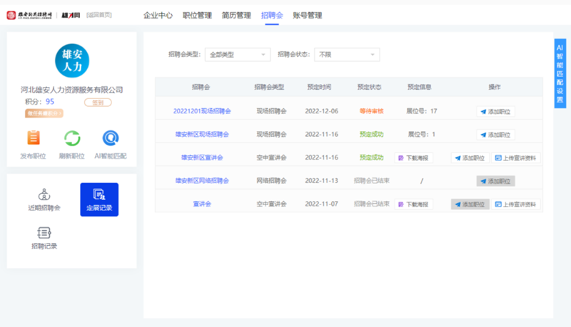 七、【招聘会】-【定展记录】页面,查看预约展位记录和预定状态,也可以点击【添加职位】按钮对分布的职位进行增删查改。