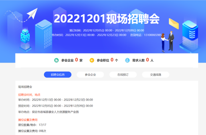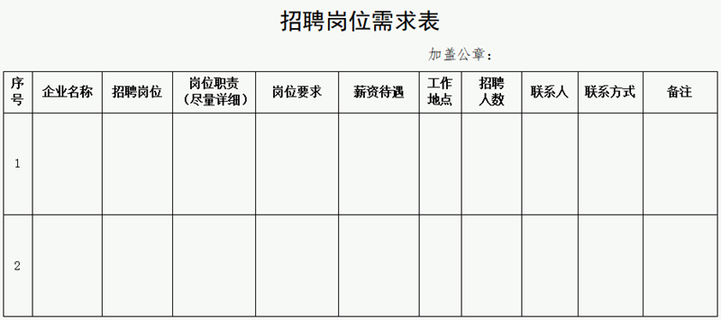 同时企业方需将营业执照复印件以及加盖公章的招聘岗位需求表提交至雄安人力资源产业园2层人力资源市场窗口处。(附件2)。咨询电话:张老师(13730275800)、赵老师(18232676055) 。