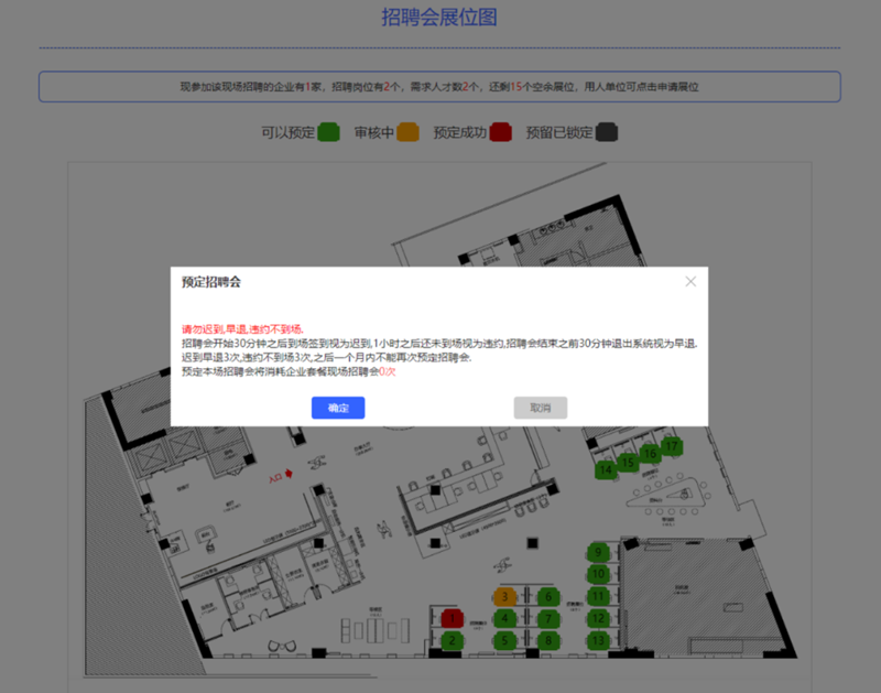 四、【招聘会】-【近期招聘会】页面,点击【我要参会】,跳转到现场招聘会【在线预定】页面,点击绿色的展位,预约参会。页面出现“预定招聘会”弹窗,点击【确定】。