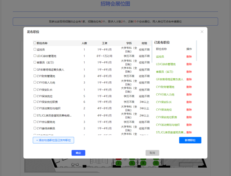 五、点击【确定】后,页面出现“分布职位”窗口,用户可以在该窗口对招聘会分布的职位进行增删查改。