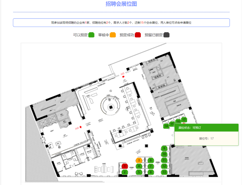 六、完成预约后,进入现场招聘会【在线预定】页面,橘黄色的展位表示预约正在审核中,展位状态从橘黄色变为红色表示预约审核通过。