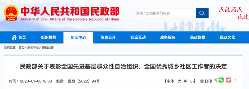 为充分发挥先进典型示范带动作用,进一步激发全国广大基层群众性自治组织和城乡社区工作者干事创业的责任感、使命感、荣誉感,民政部启动了“全国城乡社区治理专项表彰”活动。经推荐审核、意见征求、社会公示等程序,民政部决定,授予北京市西城区广安门外街道天宁寺南里社区居民委员会等200个组织“全国先进基层群众性自治组织”称号,授予金坤范等496人“全国优秀城乡社区工作者”称号。希望受到表彰的组织和个人珍惜荣誉、再接再厉,继续发挥模范带头作用,不断取得更大成绩、作出更大贡献。