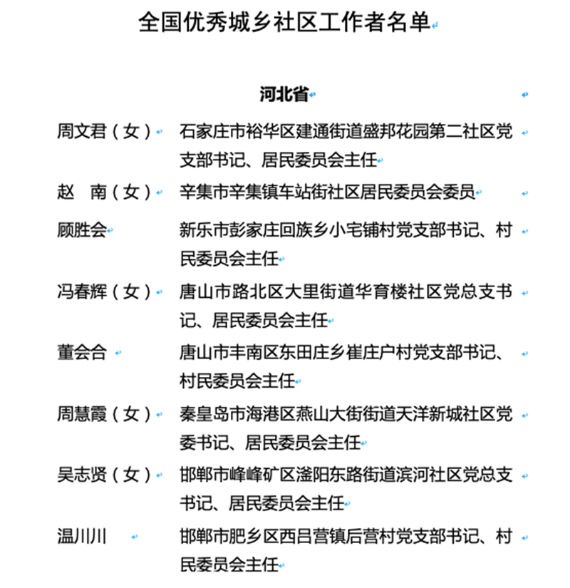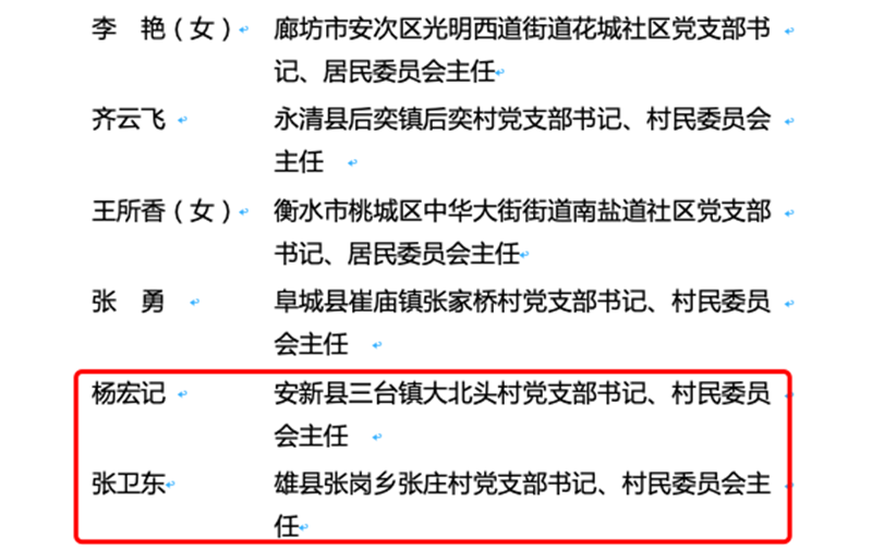 近日,民政部发布关于表彰全国先进基层群众性自治组织、全国优秀城乡社区工作者的决定。雄安新区安新县三台镇大北头村党支部书记、村民委员会主任杨宏记和雄县张岗乡张庄村党支部书记、村民委员会主任张卫东榜上有名,获评全国优秀城乡社区工作者。全文如下: