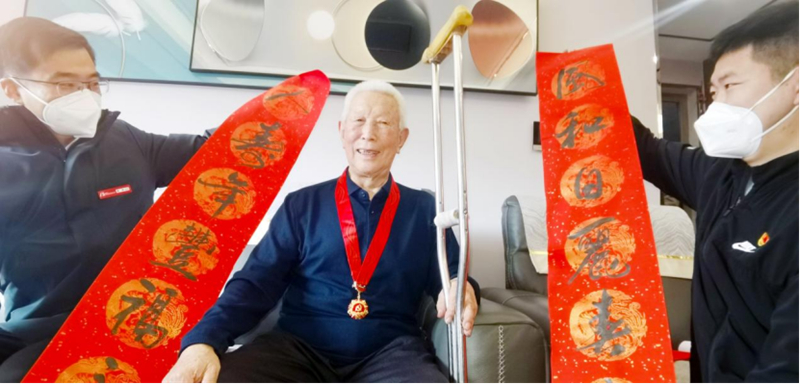 1月10日,在雄安新区容西片区飞泉中庭小区回迁居民夏维智家,社区志愿者为老人送上春联。85岁的老党员、残疾退伍军人夏维智庄重地戴上奖章向志愿者讲述心声:“老老小小一大家搬到温暖崭新的回迁房来过年,喜庆热闹,这样的日子美得很。”当日,飞泉社区等容西片区多个社区的志愿者们与中铁上海工程局工作人员走进回迁居民家中,倾听心声,慰问老党员和残疾朋友,送去温暖与祝福。