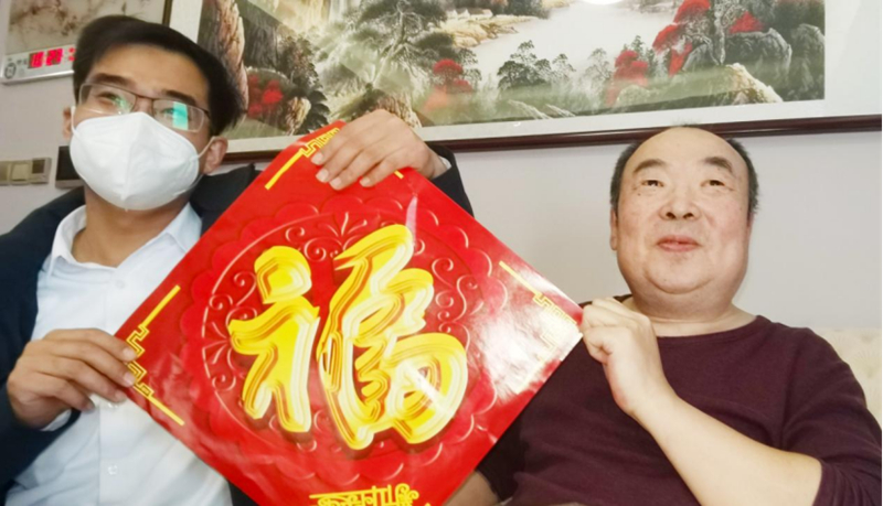 1月10日,容西飞泉中庭小区志愿者为回迁居民夏维智老人送上春联和祝福。河北新闻网记者刘光昱 摄