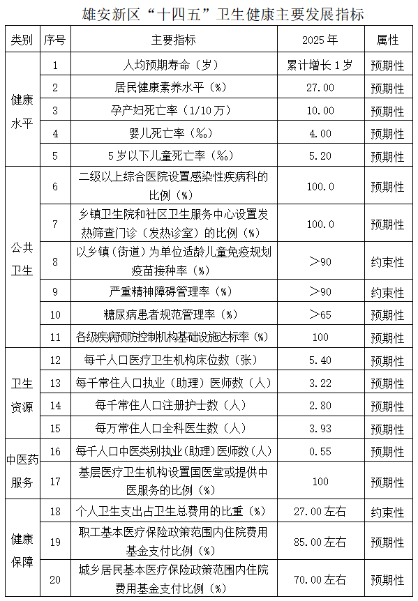 “十四五”期间,新区医疗卫生服务体系建设全面推进,京津冀协同发展格局不断完善,覆盖全体居民的基本医疗卫生制度基本建立,智慧医疗服务能力不断提升,人均预期寿命在2020年基础上提高1岁。