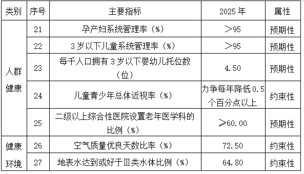 加强环境健康管理,深入开展污染防治行动,PM2.5浓度大幅下降,基本消除重污染天气。继续深化流域水污染防治,基本消除劣Ⅴ类国控断面,持续巩固城市黑臭水体治理成效。加强噪声污染治理,加强餐饮油烟治理,加强新污染物健康危害识别和风险评估。强化公共场所及室内环境健康风险评价。加强医疗废物集中处理体系与设施建设。