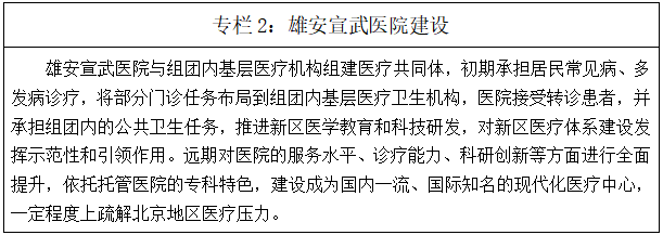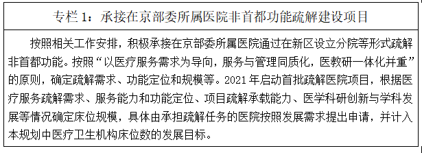 积极承接在京部委所属医院非首都功能疏解,完善配套支持政策,优化承接环境,保障疏解转移项目供地,并根据国家安排部署统筹预留发展空间,疏解项目建设所需资金由中央预算内投资保障。推动首批疏解医院、中国医学科学院雄安先进基地、雄安宣武医院等医疗机构建设,明确医疗服务疏解需求、服务能力和功能定位、疏解承载能力、医学科研创新与学科发展任务,打造医学中心和区域医疗中心,以收治转诊患者为主,重点处置疑难重症及复杂患者,缓解首都医疗服务压力。