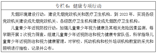 完善儿童健康服务网络,加强儿童医疗和保健服务,依托新建三级医院儿科,积极推行发育支持护理,建设集医疗、教学、科研于一体的临床重点专科,新生儿重症监护室与120联动,打造新生儿急救中心。加强儿童心理健康教育,强化儿童孤独症筛查和干预。以儿童青少年近视防控为突破口,动员家庭、学校和社会共同维护中小学生身心健康。结合学生年龄特点,推广青春健康教育、青少年性与生殖健康教育等。