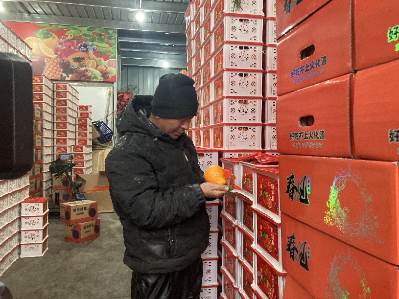 来自雄安新区的水果批发商郭永辉正在认真挑选果品。 刘赛 摄