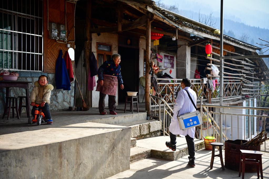 1月19日,在北川县曲山镇石椅村,村医赵太安入户走访重点人群。新华社记者张超群 摄