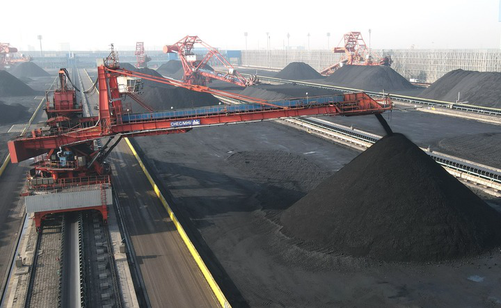 河北黄骅港煤炭堆场转运设备在作业(2023年1月8日摄,无人机照片)。新华社记者王民 摄
