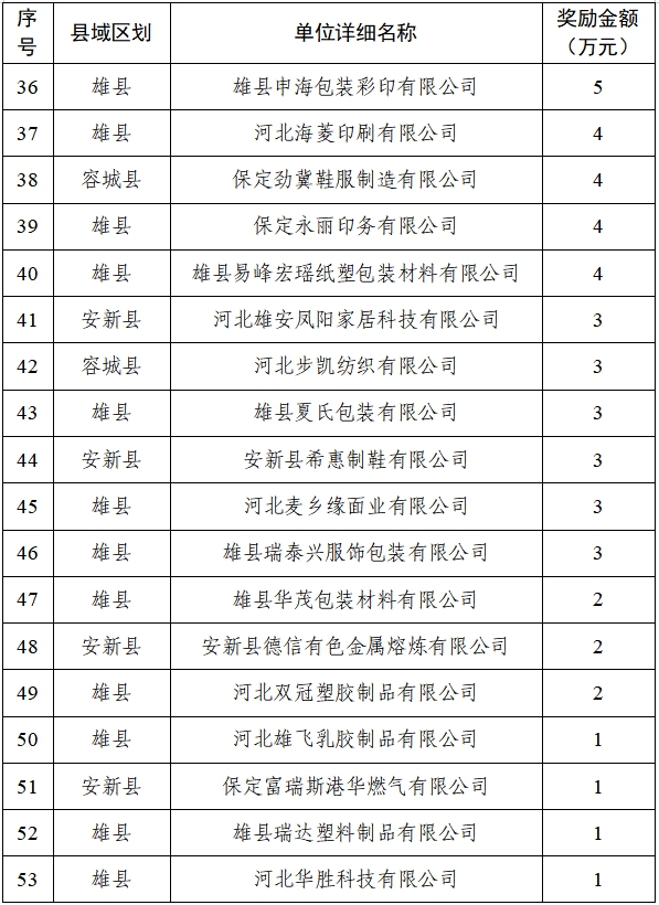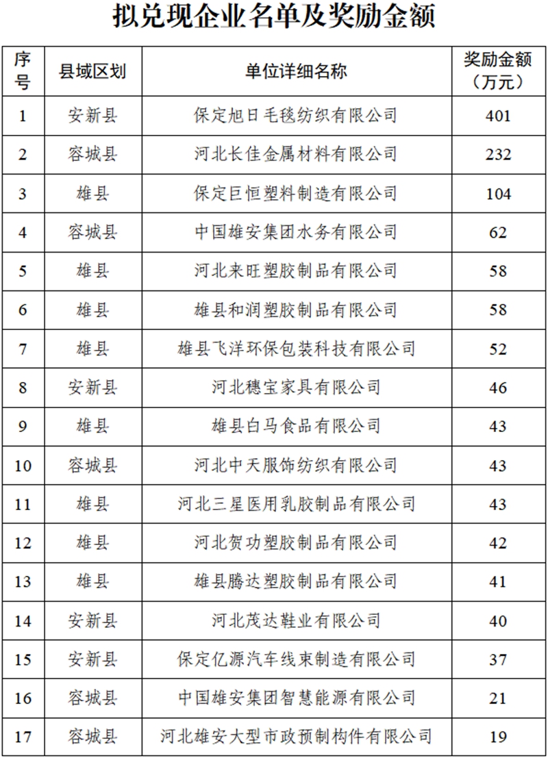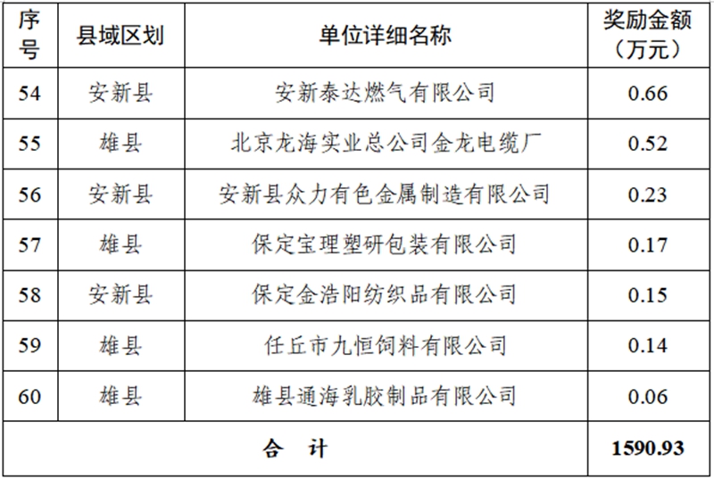 中国雄安官网2月4日电 根据《关于支持传统产业抗疫纾困转型升级的十条政策措施》和《关于推进规上工业企业培育发展工作的四条措施》等文件精神,我局开展了新区2022年度传统产业地方贡献奖励“免申即享”工作,奖励对象为2022年对新区地方经济作出较大贡献且当年未发生重大税收、生态环保、安全生产等问题的规模以上工业企业(含当年新建投产入统企业)。经过数据比对、征求部门意见等环节,共有60家企业拟符合兑现条件,拟兑现金额1590.93万元,现将名单和奖励金额等进行公示。