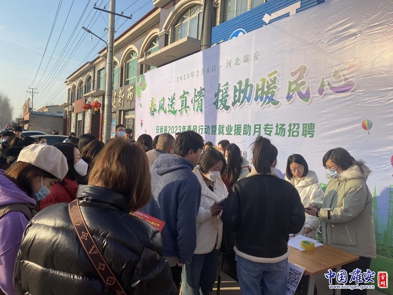中国雄安官网2月8日电(崔利杰)春风送真情,援助暖民心!2月8日,安新县人力资源和社会保障局、河北雄安新区人力资源有限公司在安新县容新路大王镇中六村联合举办了安新县2023年春风行动暨就业援助月专场招聘会,为用人单位和有就业创业意愿的农村劳动者、脱贫人口(含防止返贫监测对象)、退役军人、回迁群众、高校毕业生、残疾人等重点帮扶对象,提供精准高效的就业服务。