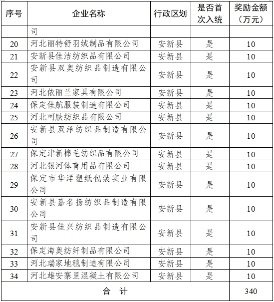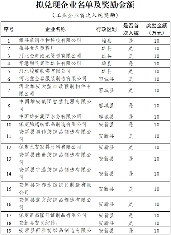 根据《关于推进规上工业企业培育发展工作的四条措施》精神,我局开展了雄安新区2022年度工业企业入统奖励“免申即享”工作,奖励对象为2022年首次提升规模或新建投产纳统的规模以上工业企业以及入统两年内营业收入超过亿元的企业,共有38家企业拟符合兑现条件,拟兑现金额400万元,现将名单和奖励金额等进行公示。