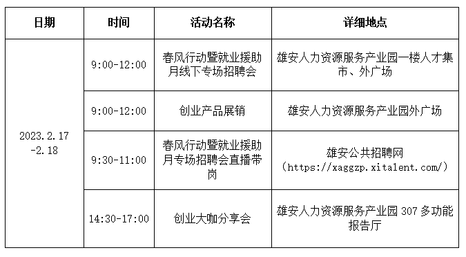 中国雄安官网2月15日电 为进一步促进雄安新区群众实现更高质量更加充分就业,助力新区“五新”目标加快实现,2月17日至2月18日,雄安新区2023年春风行动暨就业援助月大型招聘活动将在雄安人力资源服务产业园人才集市举办。