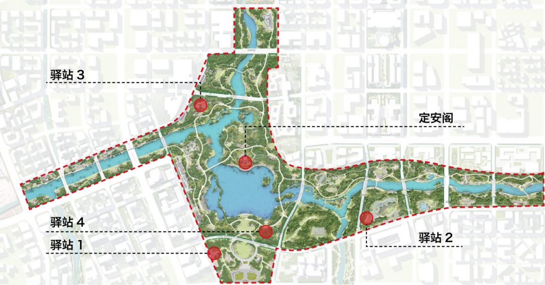 金湖公园中央湖区配套公共空间分为两类:(1)驿站类,共4座,每座建筑面积约250平方米,可利用面积约800平方米;(2)园林观景建筑1座(定安阁),建筑面积约800平方米。