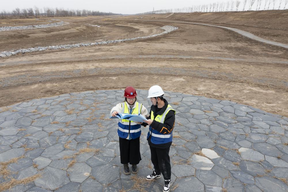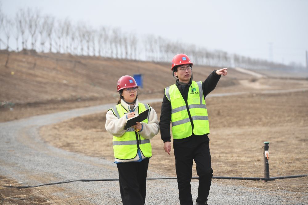 杨鑫博(左)和同事在雄安唐河河谷郊野公园项目现场工作(2月15日摄)。新华社记者朱旭东 摄