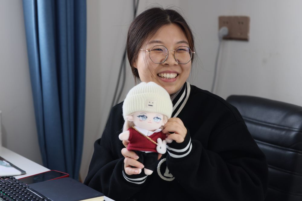 杨鑫博在项目部办公室展示新购买的玩偶(2月15日摄)。新华社记者邢广利 摄