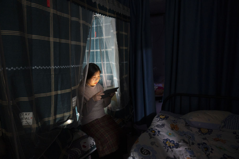杨鑫博在项目部宿舍玩网络游戏(2月15日摄)。新华社记者才扬 摄
