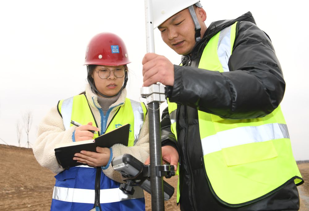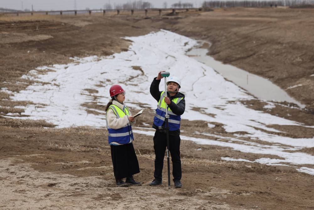杨鑫博(左)和同事在雄安唐河河谷郊野公园项目现场勘测(2月15日摄)。新华社记者邢广利 摄