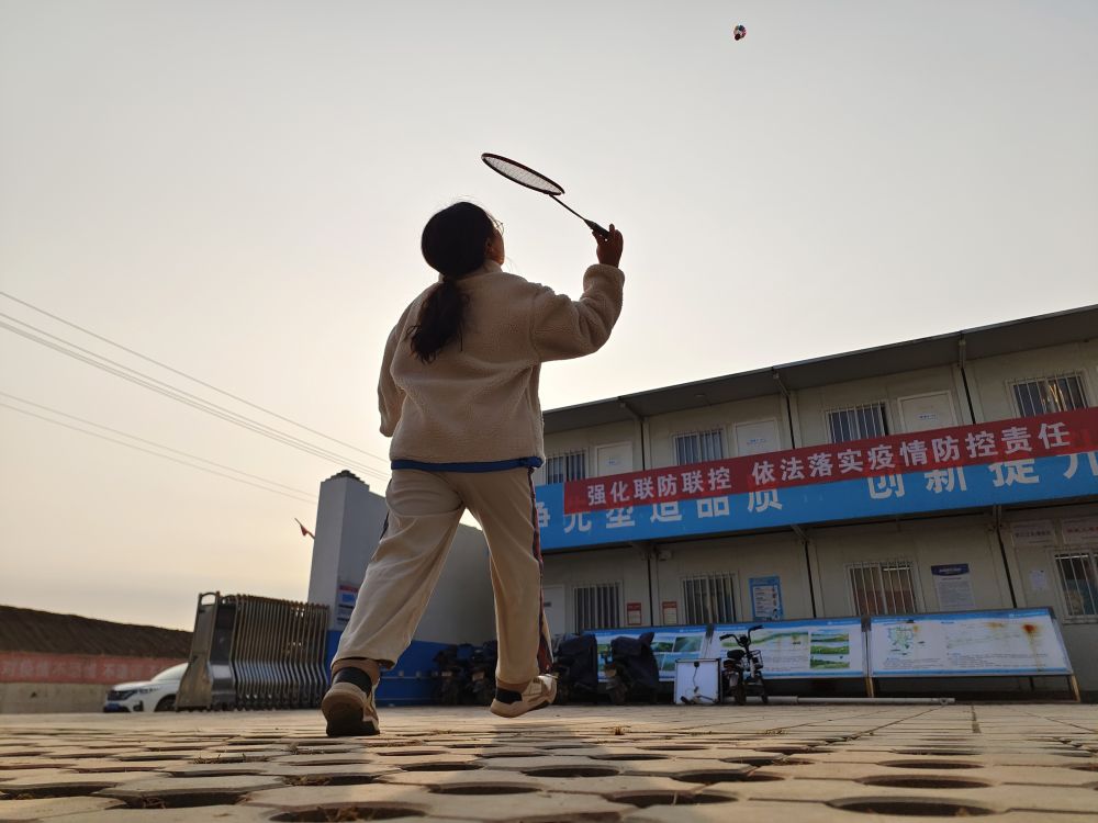 杨鑫博在项目部小院打羽毛球(2月15日摄)。新华社记者 邢广利 摄