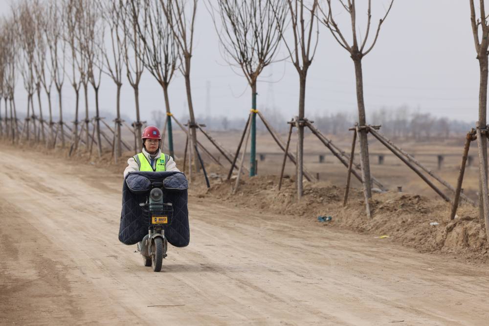 杨鑫博骑行前往雄安唐河河谷郊野公园项目现场(2月15日摄)。新华社记者邢广利 摄