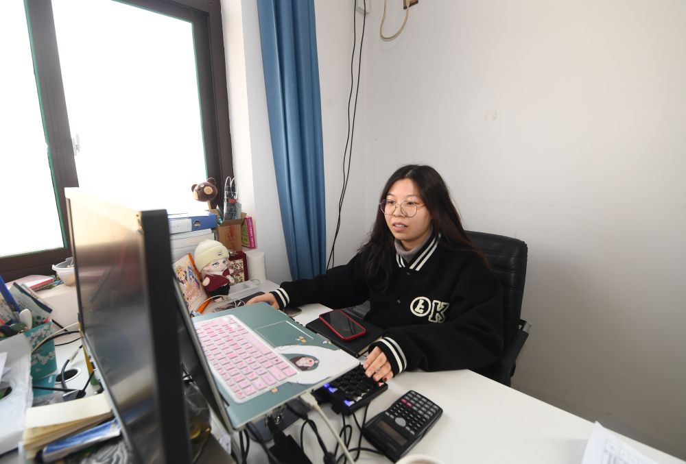 杨鑫博在项目部办公室工作(2月15日摄)。新华社记者朱旭东 摄